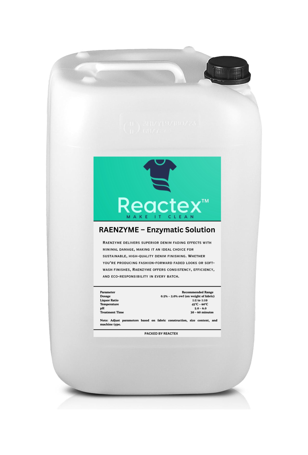 Raenzyme is a high-performance cellulase enzyme formulation specially designed for denim garment washing. It effectively breaks down surface cellulose fibers, delivering a natural, aged, stone-washed effect without damaging the fabric’s strength or color depth.
